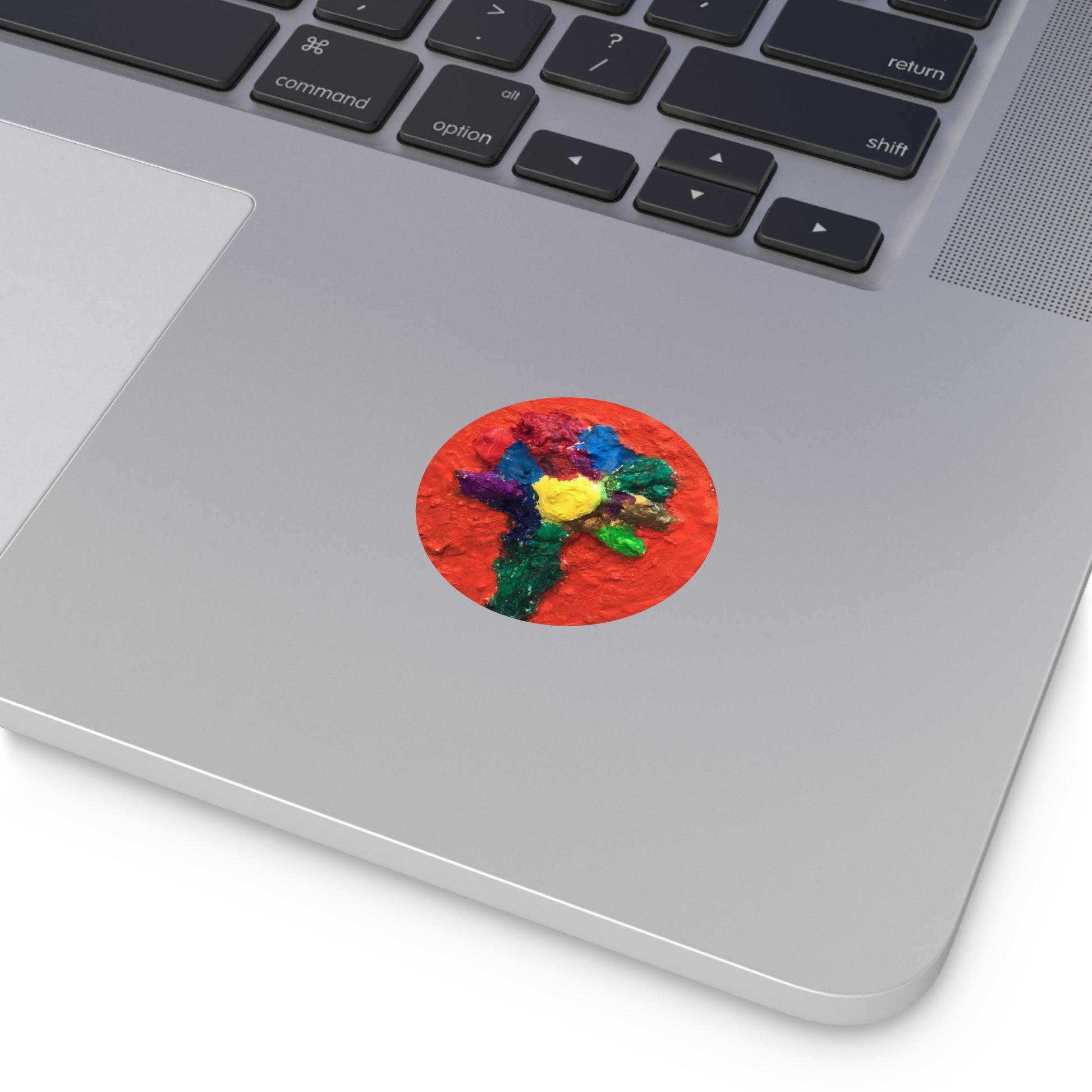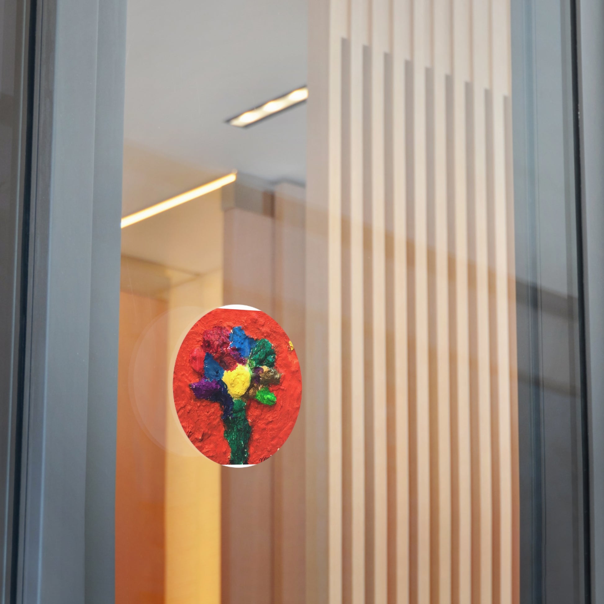 A small burst of handcrafted color—this round vinyl sticker captures a textured, painterly flower in bold primaries against a warm red field. The matte surface keeps reflections low while the rich Eco-Solvent inks hold deep, saturated hues. Weather-resistant and lightly peelable, it clings to water bottles, sketchbooks, laptop lids, or the back of a phone case to add a touch of studio-made brightness to everyday things. It reads like a tiny original painting: tactile, joyful, and made to travel with you.