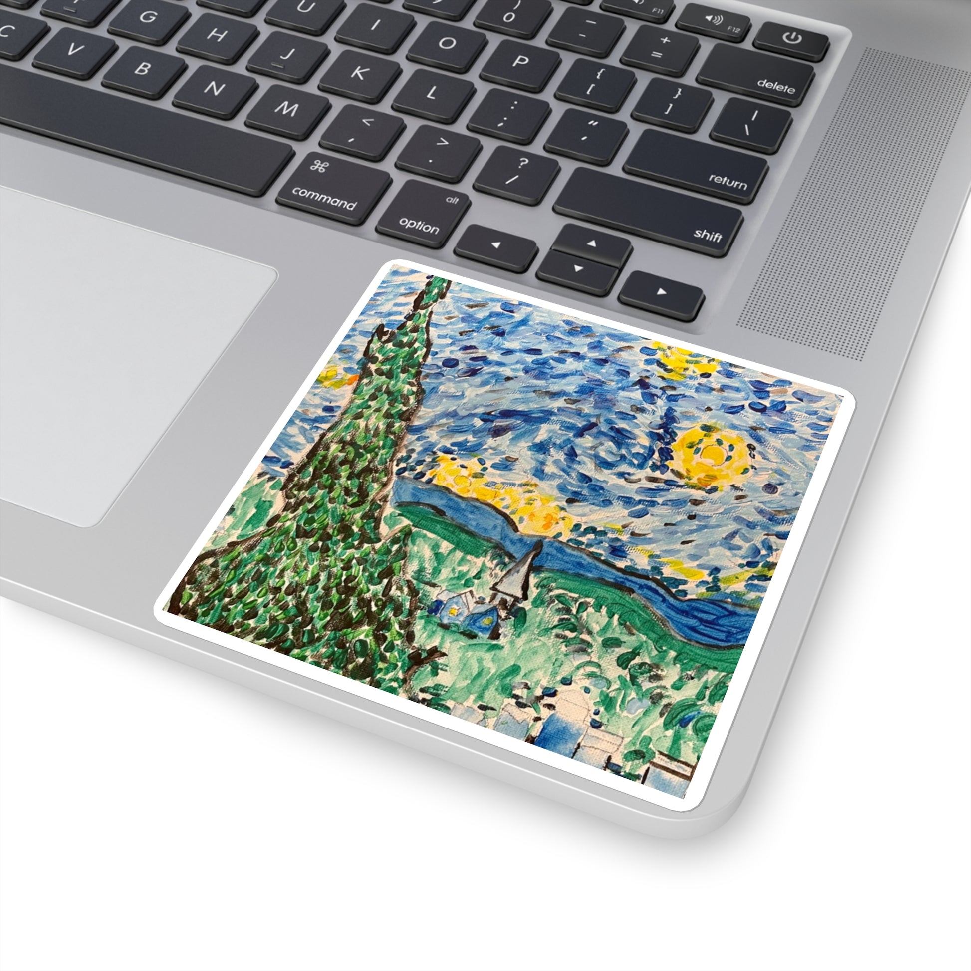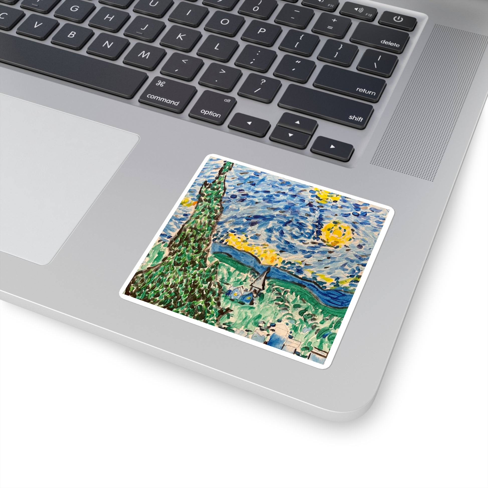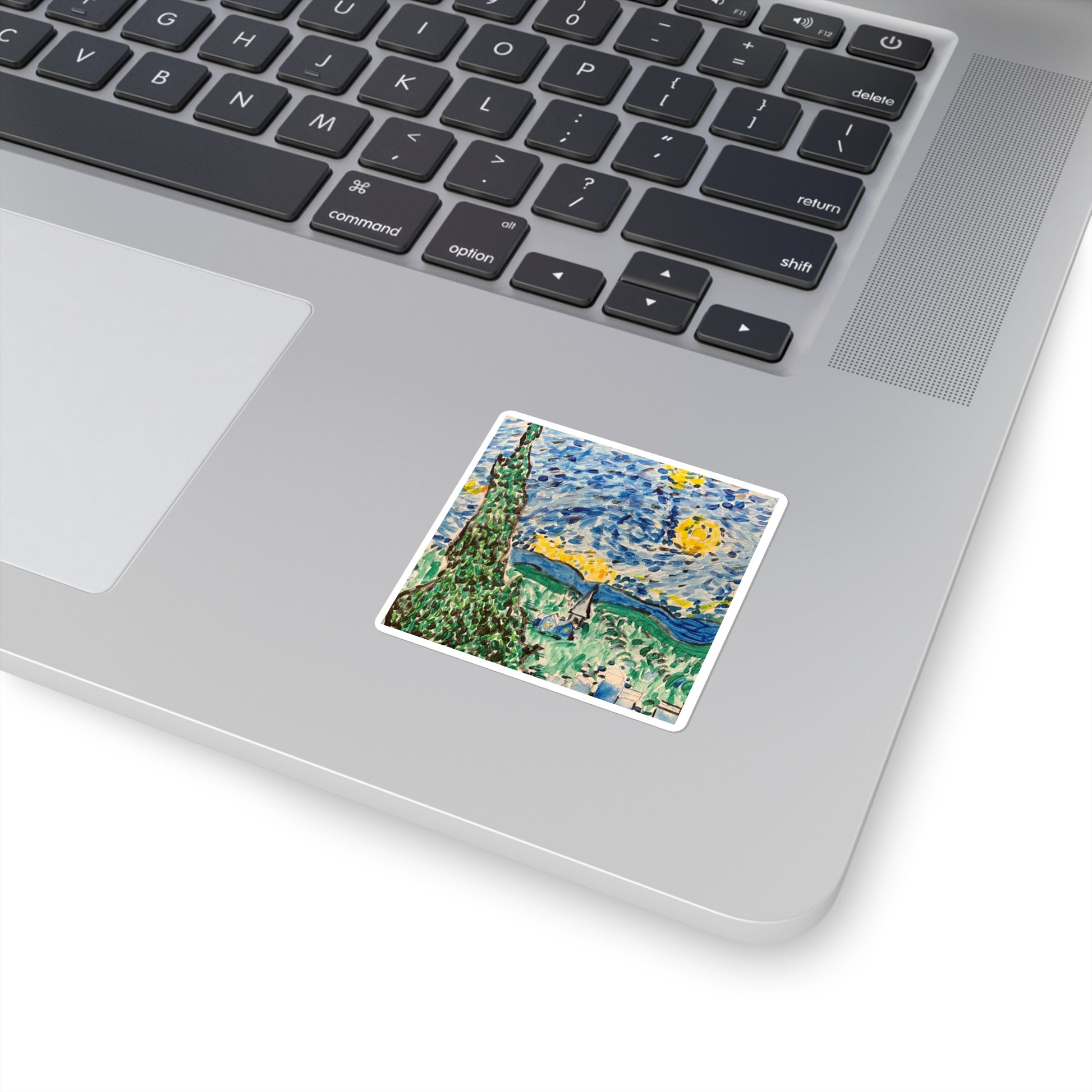 Bright, painterly square stickers that bring a touch of cozy still-life charm to laptops, journals, water-bottle sleeves, and sketchbooks. The design captures a vase of sunlit blooms rendered in lively, pointillist dashes and cool blue backgrounds — warm yellows pop against textured strokes. These glossy vinyl stickers hold vivid eco-solvent inks that keep colors punchy and lively, while the scratch-resistant surface keeps the art looking fresh through everyday wear. Choose from four compact sizes to find the right scale for your favorite surface; they apply cleanly with a strong 3M acrylic adhesive for reliable indoor use.